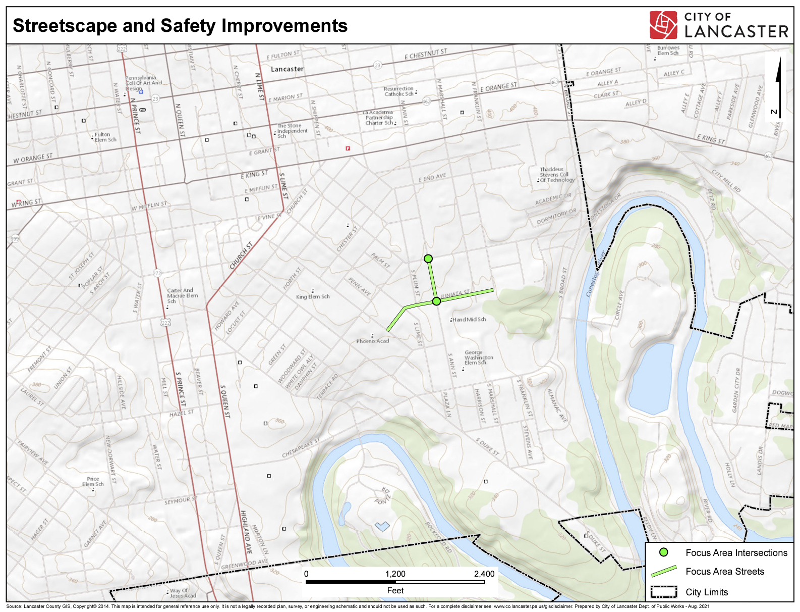 The project will include safety improvements at the intersections of South Ann and New Dauphin Streets and South Ann and Juniata Streets. It will also include streetscape improvements along South Ann Street (between New Dauphin and Juniata Streets) and Juniata Street (between Rockland Street and Stevens Avenue). See the map below.