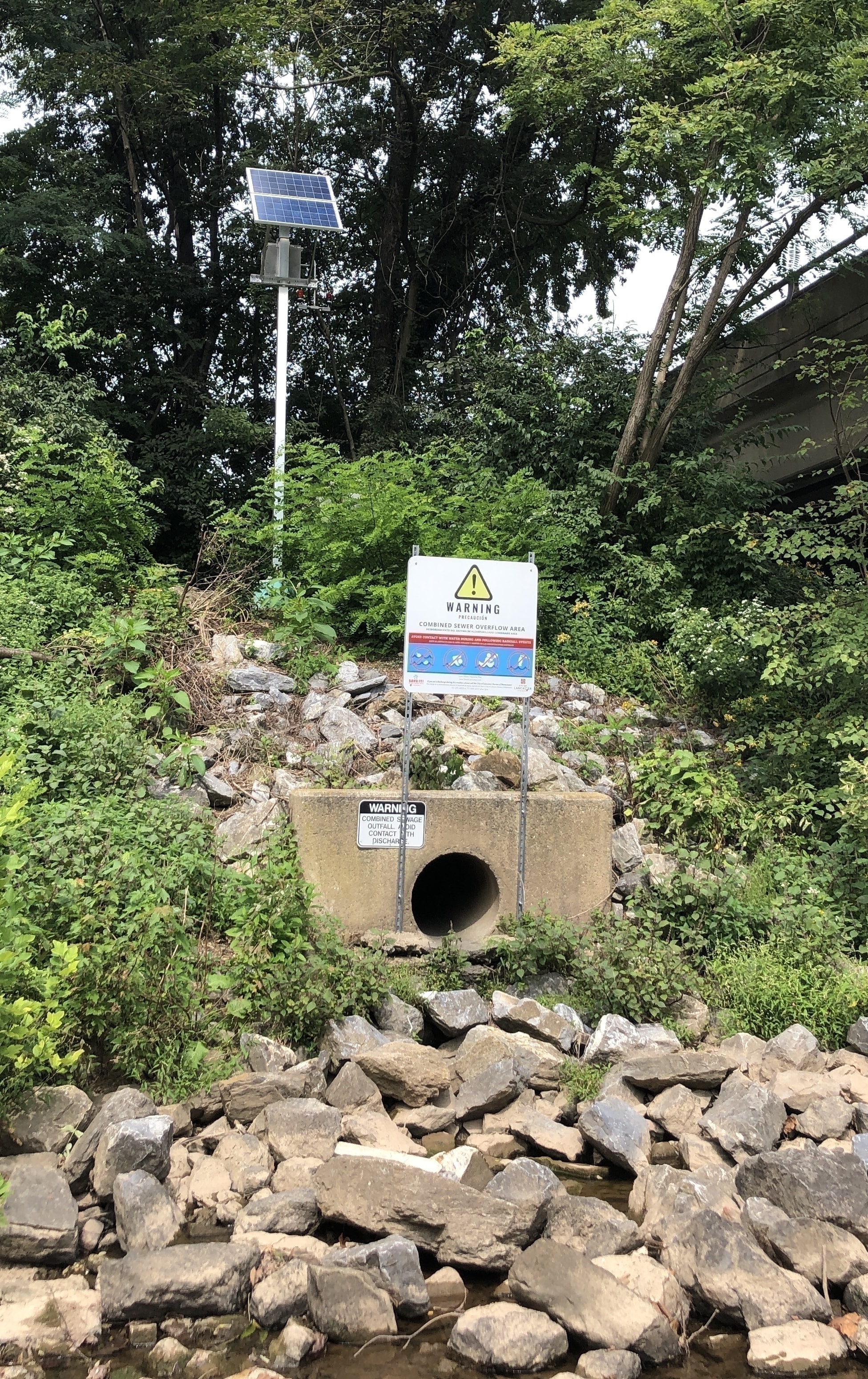 Each outfall has a sign beside it alerting people to avoid contact with the water during and immediately following an overflow. Each outfall also has a light calling attention to the sign and alerting people to stay out of the water when there are CSO events.